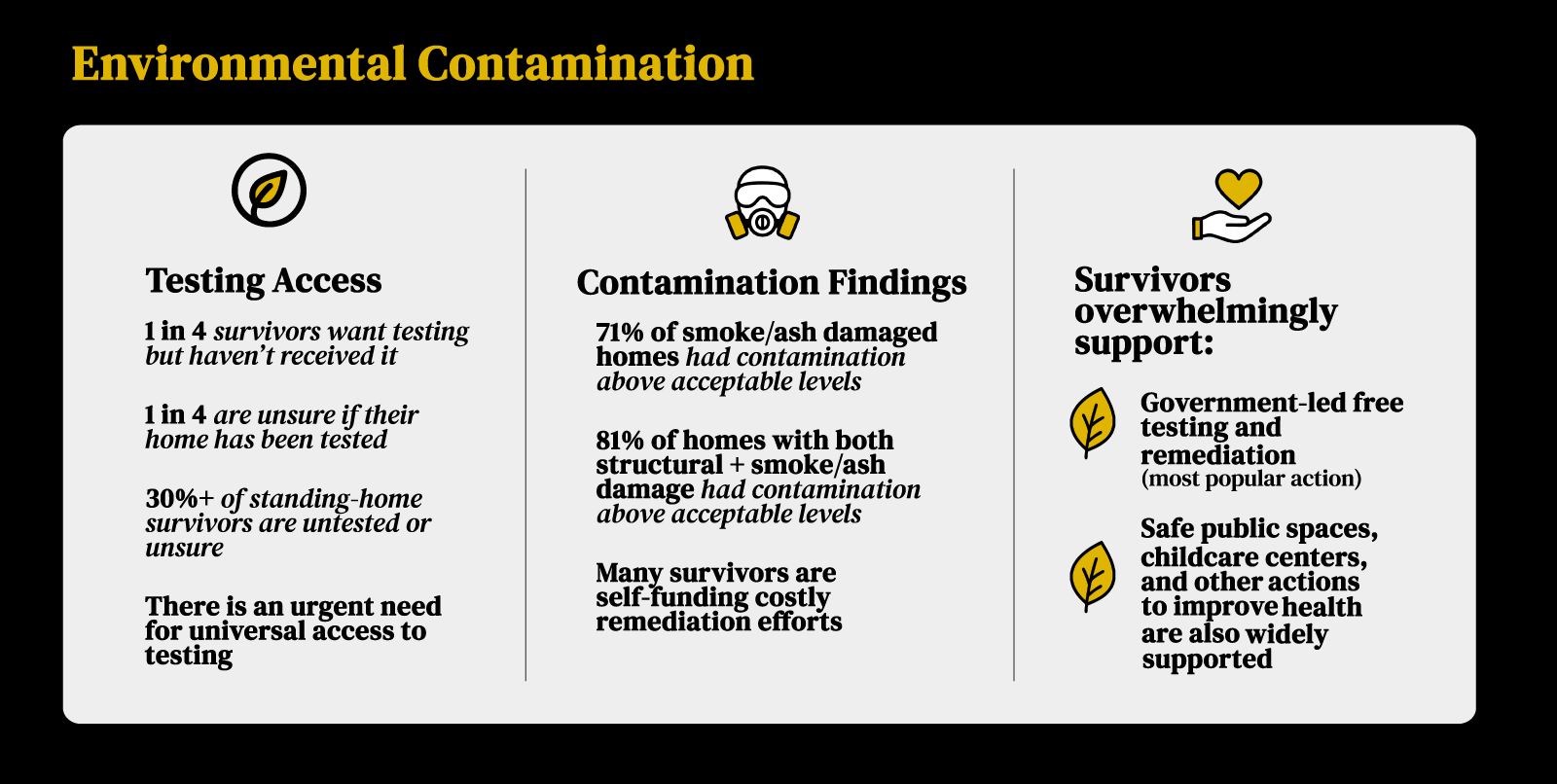 One in four survivors seeking contamination testing for their properties have been unable to access it. Among those who have secured testing, the vast majority with standing homes reported contaminant levels above acceptable levels.